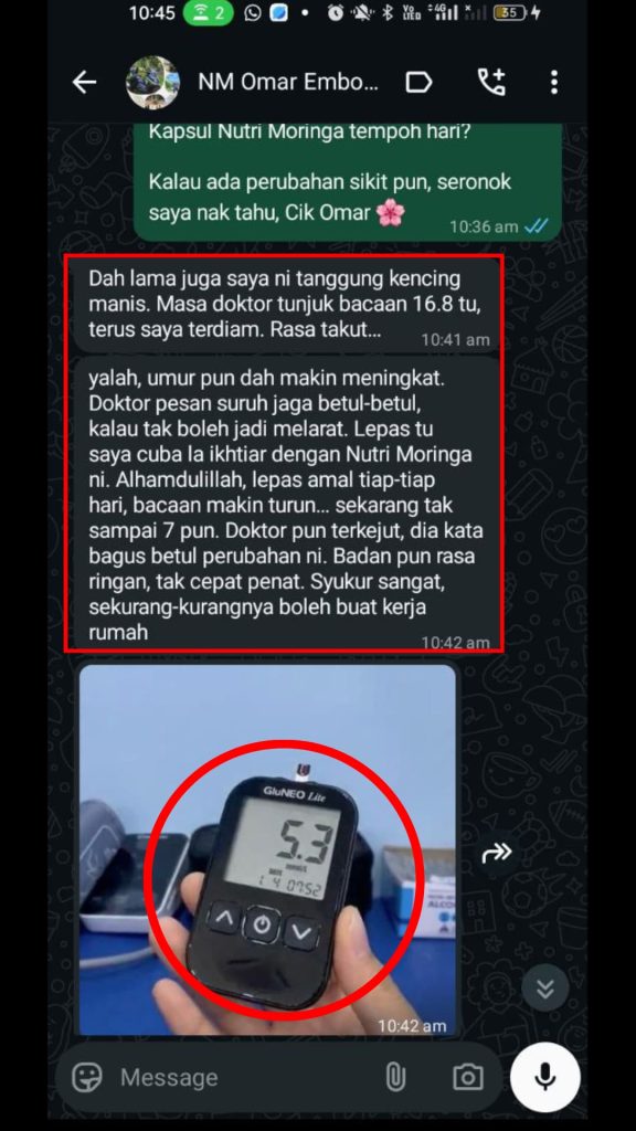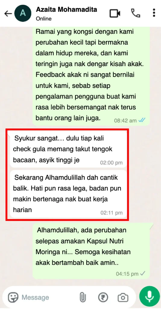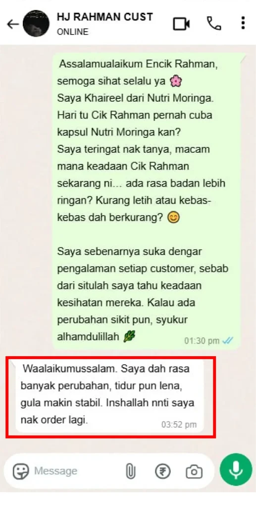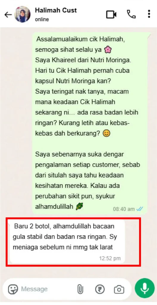Kesan Dialami Pengguna Nutri Moringa Niska Seawal 30 Hari Melalui Feedback di Whatsapp